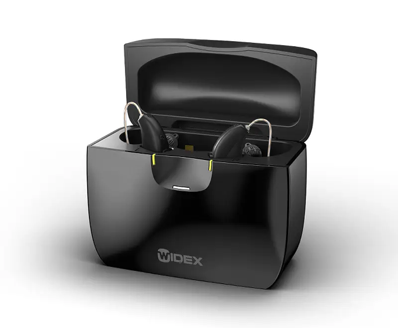 Thankfully, the Charge N Clean Charger is incredibly easy to use. Simply place your Widex Moment hearing aids inside to take advantage of this 3-in-1 charger.